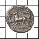 [KA]TANAIΩN. Viergespann nach l. Oben von l. heranfliegende, den Lenker bekränzende Nike. Im Abschnitt ein Fisch. |