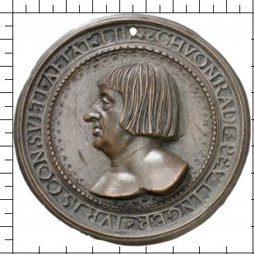 CHVONRADI - PEVTINGER - IVRIS CONSVLTI AETAT - LII [verschiedene Trennungszeichen]. Brustbild des Konrad Peutinger nach links, mit bloßer Brust, unbedecktem Haupt und längerem Haar. Das Feld ist eingefasst durch einen Punktkreis und ein aus Halbmonden und Punkten zusammengesetztes Ornament.