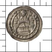 BERTOLDVS EPISCOVS NVM [Bertoldus Episcopus Numburgensis]. Über einem Torbogen mit zwei seitlichen Türmen das Brustbild des Heiligen Petrus mit Kreuzstab in der Rechten und Schlüssel in der Linken. Im Torbogen ein mehrstöckiges Gebäude (Naumburger Dom?).