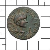 AV K Π Λ OVAΛEΡIANOC. Drapierte Büste des Valerianus I. in der Rückenansicht mit Lorbeerkranz nach r. Im r. F. die Wertangabe I (= 10 assaria).