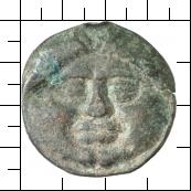 Gorgoneion in der Frontalansicht. Der Mund ist geschlossen, die Zunge nicht sichtbar.