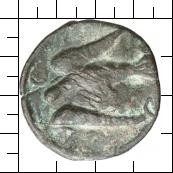 Ο-Λ/B-Ι. Adler mit erhobenen Flügeln auf einem Delphin nach l., den Kopf gesenkt.