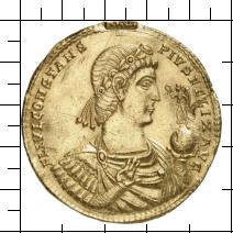 FL IVL CONSTANS - PIVS FELIX AVG. Drapierte Panzerbüste des Constans mit Diadem in der Brustansicht nach r., die l. Hand hält einen Globus, darauf eine den Kaiser bekränzende Victoria, die r. ist grüßend erhoben.