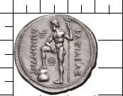 BAΣIΛEΩΣ / ΔHMHTPIOY. Poseidon steht mit einem Dreizack in der l. Hand und den r. Fuß auf einen Felsen gesetzt nach l. Der r. Arm ist auf das aufgestellte r. Bein gelegt. Im l. F. oben ein Monogramm, unten zwischen den Beinen HR (ligiert) in Kranz.