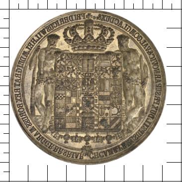 FRIDERICUS WILHELM DEI GRAT REX BORUSS MARGGR BR S R I APR-CH CAM & PR EL SUPSIL DUX PR SUP AR NOVIC & VAL COM GLAC DUX & [spiegelverkehrt]. Bekrönter Wappenschild zwischen zwei Wilden Männern. |
