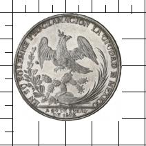 EN SU SOLEMNE PROCLAMACION LA CIUDAD D MEXICO // A 24 DE ENERO / DE 1823. Gekrönter Adler auf Nopalkaktus sitzend, umgeben von Lorbeer- und Palmzweig. Im Abschnitt Schrift. |