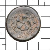 PO. Rosenblüte in der Ansicht von oben, umgeben von einem Eichenkranz. Magistratsname ZHNΩN.