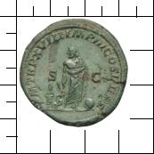 P M TR P XVIII IMP III COS IIII P P. Asklepios, frontal stehend und Kopf nach l. Er hält einen Schlangenstab in der r. Hand. Auf der Standlinie r. ein Globus, l. ein kleiner frontal stehender Telesphoros. Beiderseits S - C.