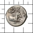 QRTHDST [Punisch für 'Karthago']. Pferdevorderteil (protome) mit Zaumzeug und Zügeln nach r. springend. Davor Getreidekorn, darüber fliegt Nike nach r., den Pferdekopf bekränzend. |