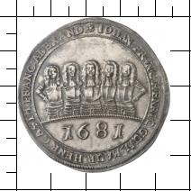 IOHAN FRANC HENRIC GUIL MAUR HENR CASIM FRANC ALEXAND // 1681. Umschrift zwischen zwei Zierkreisen, getrennt durch Rosette. Im Feld die gepanzerten Hüftbilder der fünf Brüder von vorn. |