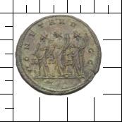 FL VAL CONSTANTIVS N-OB C. An der l. Schulter drapierte Panzerbüste des Constantius Chlorus mit Lorbeerkranz und geschultertem Speer in der r. Hand in der Brustansicht nach l. Der Panzer ist mit einer Aegis verziert. |