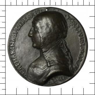 Oben gelocht. - Caterina Sforza, Gräfin von Forlì und Imola, illegitime Tochter des Mailänder Herzogs Galeazzo Maria Sforza und der Lucrezia Landriano, heiratete 1477 Girolamo Riario, wurde 1488 Witwe und 1496 die Gemahlin von Giovanni de Medici, zuvor war sie seit 1490 in geheimer Heirat mit dem 1495 ermordeten Jacopo Feo verbunden. Die Medaille ist nach 1488 entstanden, da das Porträt mit Witwenschleier dargestellt ist.