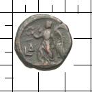 L Δ [Jahr 4]. Nike schreitet nach l. Sie hält in ihrer r. Hand einen Kranz und in der l. Hand einen Palmzweig.