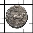 Viergespann (quadriga) mit Wagenlenker im Schritt nach r., oben eine Nike das Gespann bekränzend nach r., im Abschnitt ein Meerdrachen (ketos) nach r. |