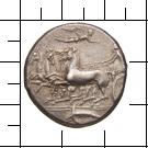 Gespann in Dreiviertelansicht nach l. Darüber Nike mit Siegeskranz nach r., den Lenker zu bekränzen. Das dritte Pferd blickt sich um, das zweite reißt Kopf nach oben. Unter der Abschnittslinie, diese mit Rückenflosse durchbrechend, ein Delphin nach l. |