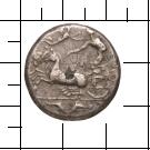 Viergespann (quadriga) in Dreiviertelansicht nach l., darüber fliegt Nike mit Siegeskranz nach r., den sehr groß dargestellten Lenker zu bekränzen. Unter der Abschnittslinie schwimmen zwei Delphine aufeinander zu.