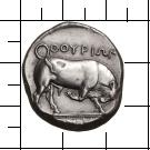 ΘΟΥΡΙΩΝ. Ein stoßender Stier mit gesenktem Kopf, erhobenem Vorderbein und auf den Rücken geworfenem Schwanz nach r., unter der doppelten Bodenlinie, die untere eine Punktlinie, ein Fisch nach r. In winzigen Buchstaben auf der Flanke des Stiers VE in Ligatur. |