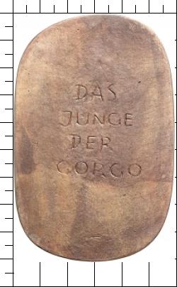 Guss, einseitig, braun, etwas blaugrün patiniert. Gorgo war eine kluge Spartanerin. Sie war Tochter, Ehefrau und Mutter von Königen Spartas. Sie soll vor den Angriffen des persischen Großkönigs Xerxes gewarnt haben. Das Junge der Gorgo ist als Berliner Göre dargestellt, die dem Betrachter die Zunge herausstreckt.