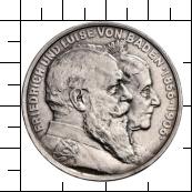 Die Münze wurde geprägt anläßlich der Goldenen Hochzeit des badischen Großherzogpaares Friedrich I. und Luise. Luise Marie Elisabeth von Preußen war die Tochter von Prinz Wilhelm von Preußen, dem späteren Kaiser Wilhelm I., und seiner Frau Augusta von Sachsen-Weimar-Eisenach. Sie heiratete den Großherzog von Baden am 20. September 1856 im Berliner Stadtschloss. 1859 gründete sie in Karlsruhe den ersten badischen Frauenverein und widmete sich dem Aufbau des Roten Kreuzes.