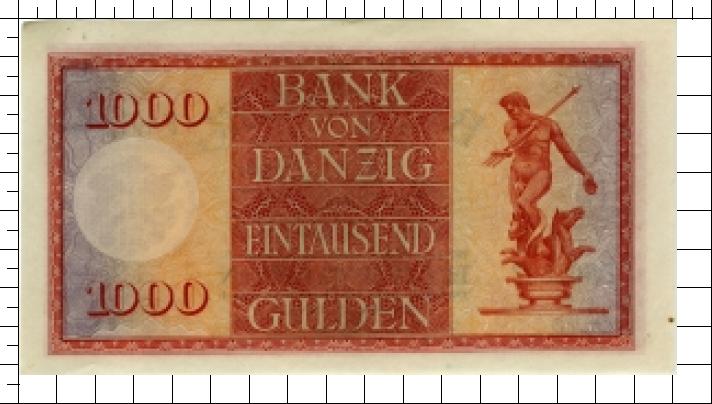 1000 BANK VON DANZIG EINTAUSEND GULDEN. Text in einem Rahmen. Im Feld links die Wertzahl über und unter Medaillon mit Wasserzeichen, rechts Detail vom Neptunbrunnen.