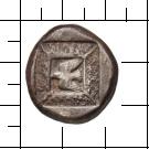 Quadratum incusum mit kleinerem Mittelquadrat, darin fliegt ein Adler mit ausgebreiteten Schwingen nach l. Der breite Rand darum ist wie ein Rahmen mit aufgerauter Oberfläche und Gehrung gestaltet.