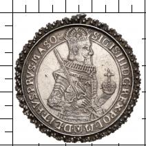 SAM LIV NEC NO SV-E GOT VAD Q HR REX. Bekrönter Wappenschild Adler (Polen) und Reiter (Litauen), umhangen mit der Kollane des Ordens vom Goldenen Vlies, darauf Schild Kronen (Schweden), Löwe (Gotland), darauf Herzschild Garbe (Wasa). Aussen I-I (für Jakob Jakobson), 16-31. |