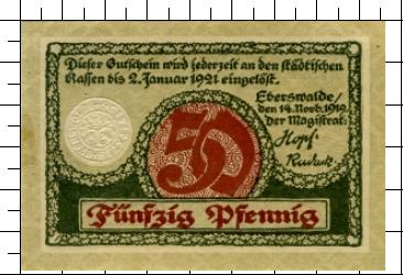Dieser Gutschein wird jederzeit an den städtischen Kassen bis 2. Januar 1921 eingelöst. Eberswalde, den 14. November 1919. Der Magistrat 50 Fünfzig Pfennig. In einem Rahmen aus Eichenlaub Wertangabe, Ausgeber.