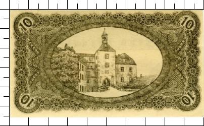 10 Pfennig Gutschein der Stadt Finsterwalde N./L. über Zehn Pfennig [...] Vorstehenden Betrag zahlt unsere Stadthauptkasse d. Einlieferer dies. Scheines Gültigkeit bis 1 Monat nach erfolgtem Widerruf d. ortsübliche Bekanntmachung. Stadtansicht, Wertangabe, Ausgeber. |