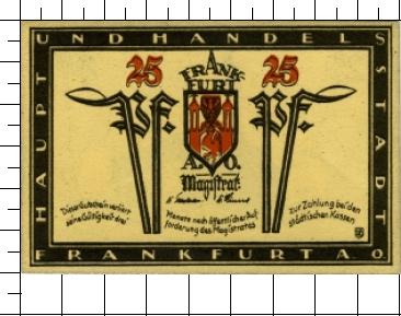 | Vorderseite | HAUPT UND HANDELSSTADT FRANKFURT A. O. 25 Pf. FRANKFURT A. O. Magistrat 25 Pf. Dieser Geldschein verliert seine Gültigkeit drei Monate nach öffentlicher Aufforderung des Magistrates zur Zahlung bei den städtischen Kassen. Wertangabe, Ausgeber. Unten rechts wappenartiges Signet mit 'GB'. |