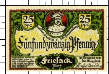 25 PFG Kurfürst Friedrich I. von Brandenburg 25 PFG Fünfundzwanzig Pfennig Der Gutschein verliert seine Gültigkeit, wenn er nicht innerhalb eines Monats nach der vom Magistrat erlassenen Aufforderung ... Friesack/Mark im November 1921 Der Magistrat. Brustbild von Kurfürst Friedrich I. von Brandenburg. Wertangabe, Ausgeber.