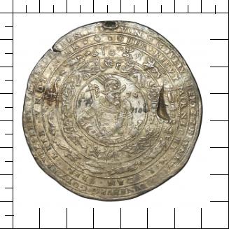 VON G G IVLIVS HERTZ Z BRVNSWIG V LVNEBVRG GOTTES VERSEHN MVS GESCHEHEN / O HER BEHVT MIR NICHT MER DAN SEEL LEIB VNDT EHR. Büste Herzog Julius im Harnisch nach rechts mit geschulterter Streitaxt, daneben 1-5-76, außen zwei Kreise mit der Umschrift, ein dritter mit den Sternkreiszeichen und der innere mit den personifizierten Planeten. |