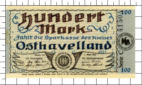 Kreisausschuß und Kreissparkasse des Kreises Osthavelland in Nauen: 100 Mark 19231923 |