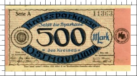 Serie ... Kreissparkasse OSTHAVELLAND 500 Mark zahlt die Sparkasse des Kreises Nauen, den 1. März 1923 Der Kreisausschuß .. Landrat .. Der Sparkassenvorstand ... Dieser Schein verliert 4 Wochen nach Aufruf in der Havelländischen Rundschau seine .... Wappen. Wertangabe, Ausgeber.