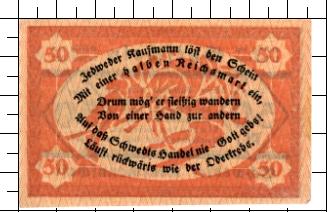 Jedweder Kaufmann löst den Schein Mit einer halben Reichsmark ein, Drum mög' er fleißig wandern Von einer Hand zur andern Auf daß Schwedts Handel nie - Gott gebs! Läuft rückwärts wie der Oderkrebs. 50 50 50 50. Im Unterdruck die rote Wertziffer 50 in allen Ecken des Zierrahmens, in der Mitte Abbildung eines Oderkrebses.