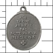 FÜR / TREVE / ARBEIT / DAS / ROTE KREVZ / MERSEBVRG [Ü spitz]. Sechszeilige Aufschrift, darunter das Symbol des Roten Kreuzes. |