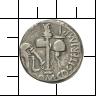 DOM COS ITER IMP. Vier Priesterattribute: Schöpfkelle (simpuvium/simpulum), Weihwedel (aspergillum), Beil (sacena) und Priesterkappe (apex).