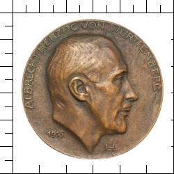 Zweiseitiger Bronzeguss, Randpunze DS 45 17.- Herzog Albrecht von Württemberg war zu Beginn des Ersten Weltkrieges Oberbefehlshaber der 4. Armee. 1916 erfolgte die Ernennung zum Generalfeldmarschall. Ab 1. März 1917 war er der Oberbefehlshaber der Heeresgruppe Herzog Albrecht am Südabschnitt der Westfront von Verdun bis zur Schweizer Grenze. Möglicherweise ist die Variante mit der Jahreszahl 1916 anlässlich der Ernennung zum Generalfeldmarschall hergestellt worden. Siehe auch Objektnummer 18239485, 18239488 und 18239489. Menadier (1917) schreibt zur Medaille: '... zu Ehren des Herzogs Albrecht von Württemberg ... den Führer der vierten Armee, der die Franzosen bei Neufchâteau geworfen hat ... Mit der Beschränkung auf die Wappentiere als kehrseitige Darstellung hat er zwar nicht eigentlich eine geschichtliche Kriegsmedaille geliefert, aber einen beachtenswerten Versuch, sich dem engen Zwange der heraldischen Regeln zu entziehen, und was doch immer die Hauptsache bleibt, das Brustbild des Helden ist durchaus vorbildlich.'