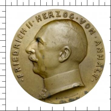 FRIEDRICH II HERZOG VON ANHALT. Brustbild von Friedrich II. in Uniform mit Ordenskreuz nach links. Unten die Signatur Fritz Heinemann.