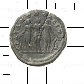 TPAIANOΠOΛEITΩN. Drei Nymphen (Chariten) in langen Gewändern. Die beiden äußeren stehen in der Vorderansicht, Kopf nach l., die mittlere in der Rückenansicht, Kopf nach r. Sie umschlingen sich an den Schultern. Die äußeren halten ein Gefäß, aus dem Wasser läuft.