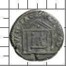 OVΛΠ-IAC TOΠ-IPOV. Tempel mit vier Säulen in Frontansicht, im Giebelfeld Schild und Speer. Im Inneren sitzt Herakles auf Fels nach l., die r. Hand vorgestreckt, die l. Hand nach hinten abgestützt. Ihm gegenüber steht eine Nymphe (?) nach r.