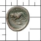 KAPΔIANΩ[N]. Ein Löwe mit einem Speer im Maul, den er mit den Vordertatzen festhält, nach l., den Kopf in die Frontale gedreht. Unter der einfachen Abschnittslinie ein Gerstenkorn. |