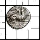 [ΑΒ]ΔH//[PIT]EΩΝ. Greif liegt mit geschlossenen Flügeln nach r. Seine l. Vorderpfote ist angehoben. Ethnikon oben und unten.