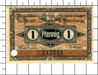 Inspektion der Kriegsgefangenenlager im Bereich des III. Armeekorps 1 Pfennig 1 DER INSPEKTEUR DER ADJUTANT BERLIN DEN 1. OKT. 1917 Zahlungsmittel für KriegsgefangeneScheine mit ganz oder teilweise fehlender Nummer können nicht eingelöst werden. Zierrahmen und Zieruntergrund. Wertangabe, Ausgeber. Als Umschrift zwölfmal 'IGEFDREI'. Links unten Lochentwertung.