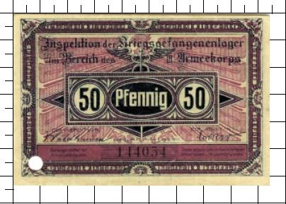 Inspektion der Kriegsgefangenenlager im Bereich des III. Armeekorps 50 Pfennig 50 DER INSPEKTEUR DER ADJUTANT BERLIN DEN 1. OKT. 1917 Zahlungsmittel für Kriegsgefangene Scheine mit ganz oder teilweise fehlender Nummer können nicht eingelöst werden. Zierrahmen und Zieruntergrund. Wertangabe, Ausgeber. Als Umschrift zwölfmal 'IGEFDREI'. Links unten Lochentwertung.