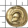Korinthischer Helm nach l. Darunter ein Thunfisch nach l. |