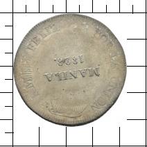 POR LA UNION FIRM[E Y FE]LIZ. Stehende Libertad (durch Überprägung unkenntlich). Überprägung: MANILA / 1828. |