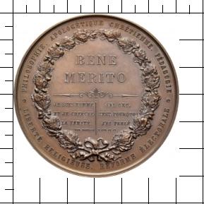 PHILOSOPHIE. APOLOGÉTIQUE CHRÉTIENNE. PÉDAGOGIE - LIBERTÉ RELIGIEUSE. REFORME ÉLECTORALE -/ BENE / MERITO / JE SUIS HOMME / ET JE CHERCHE / LA VÉRITÉ. / ERN. NAVILLE -/ J'AI / CRU / C'EST POURQUOI / J'AI PARLÉ / I COR. IV. 13. Umschrift darin eine sechszeilige Aufschrift in drei Felder untergliedert in einem Eichenkranz.