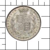 BRITANNIARUM - REGINA FID : DEF :. Der bekrönte Wappenschild in einem unten gebundenen Lorbeerkranz.