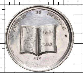 NUMERO ET MENSURAE [Mit Zahl und Maß, AE ligiert]. Aufgeschlagenes Buch. Auf der linken Seite symbolisieren Dreieck, Winkel und Quadrat die Geometrie, auf der rechten Seite die Aufschrift PAR / IMPAR (gleich / ungleich) die Arithmetik. Darunter Signatur B F (Johann Martin Bückle). |