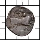 [ROMA]. Stier stoßend nach r. Darunter eine Schlange, darüber drei Wertkugeln. Über dem Ganzen das Kontrollzeichen Ähre. |